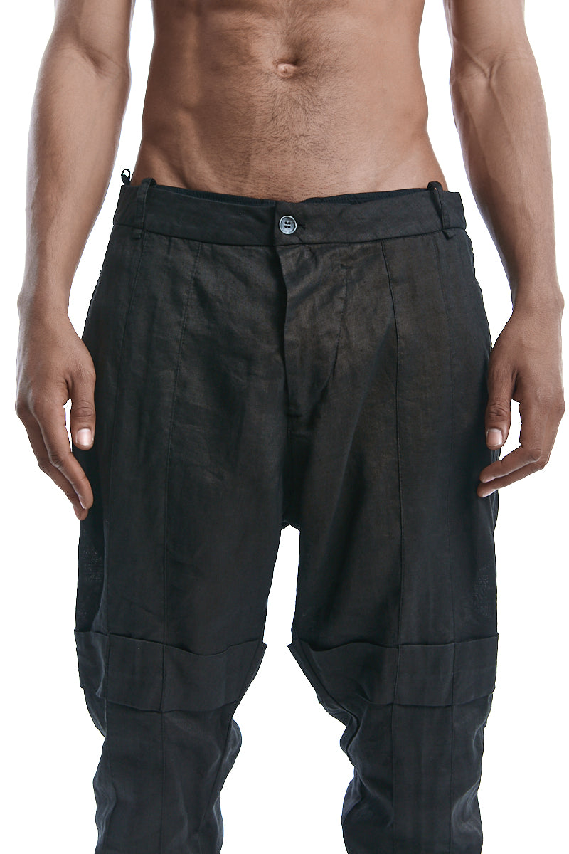 - Baggy pleated trousers in over dyed ramie with off center zip fly and semi constructed waist band