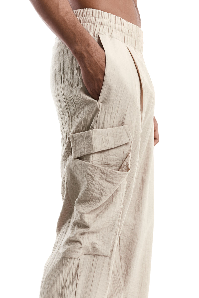 Beige Textured Viscose Comfort Cargo Pants from La Haine Inside Us